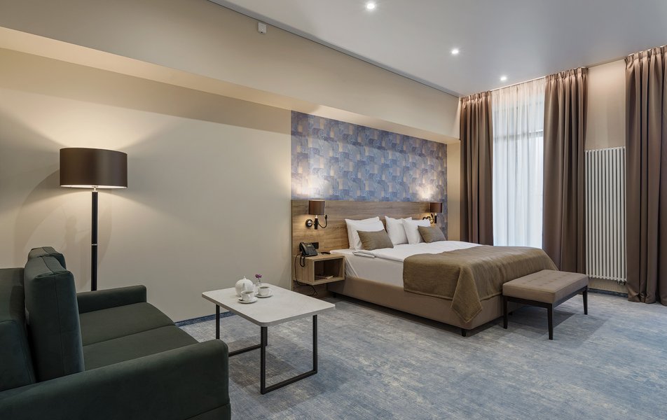 В номере: вешалка, диван, зеркало, кресло, кровать двуспальная, прикроватные тумбочки, стол, шкаф, мини-холодильник, сейф, телевизор ЖК, телефон, чайный набор посуды, электрочайник