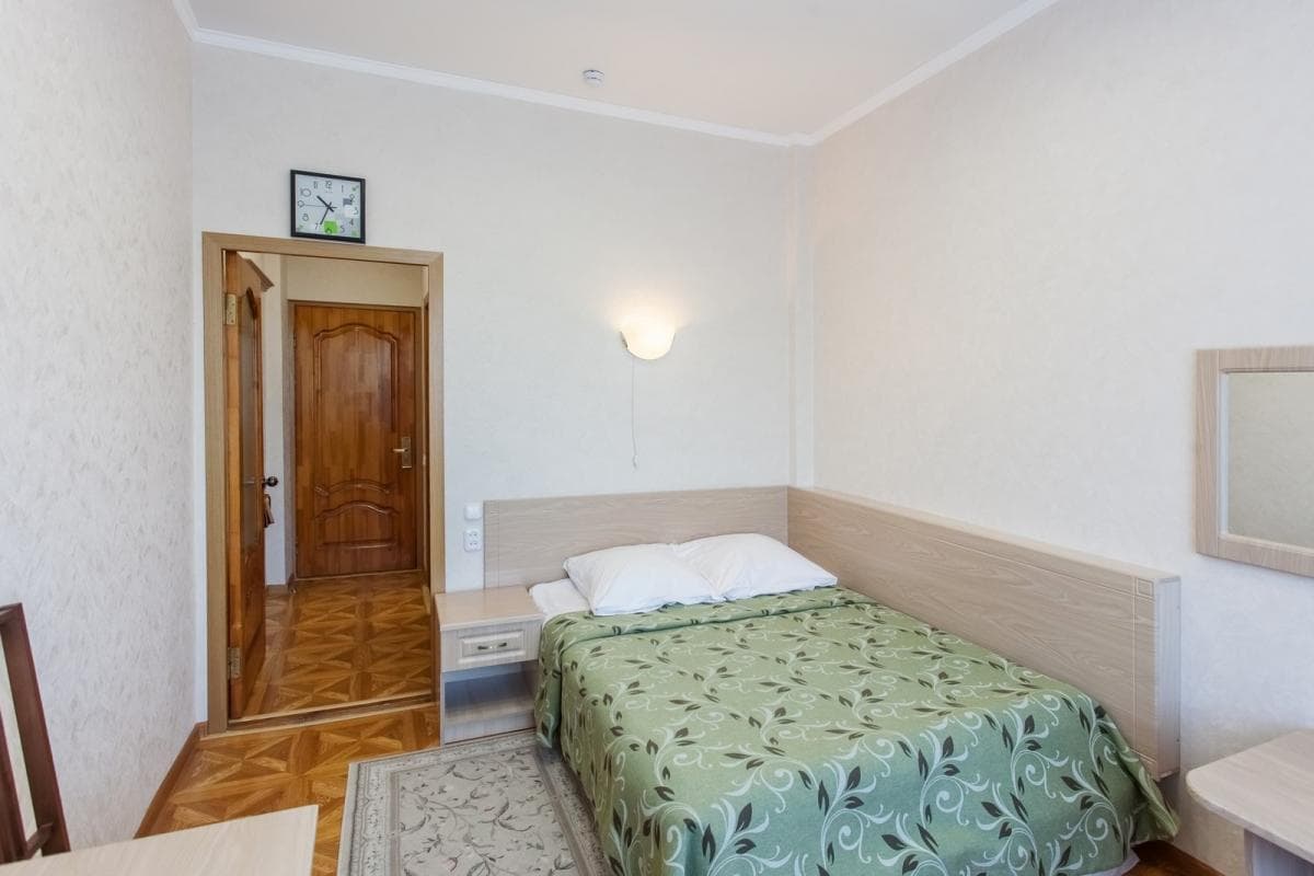 В номере: кровать, прикроватные тумбы, шкаф, стол, стулья, холодильник, спутниковое кабельное ТВ, электрочайник, набор посуды
